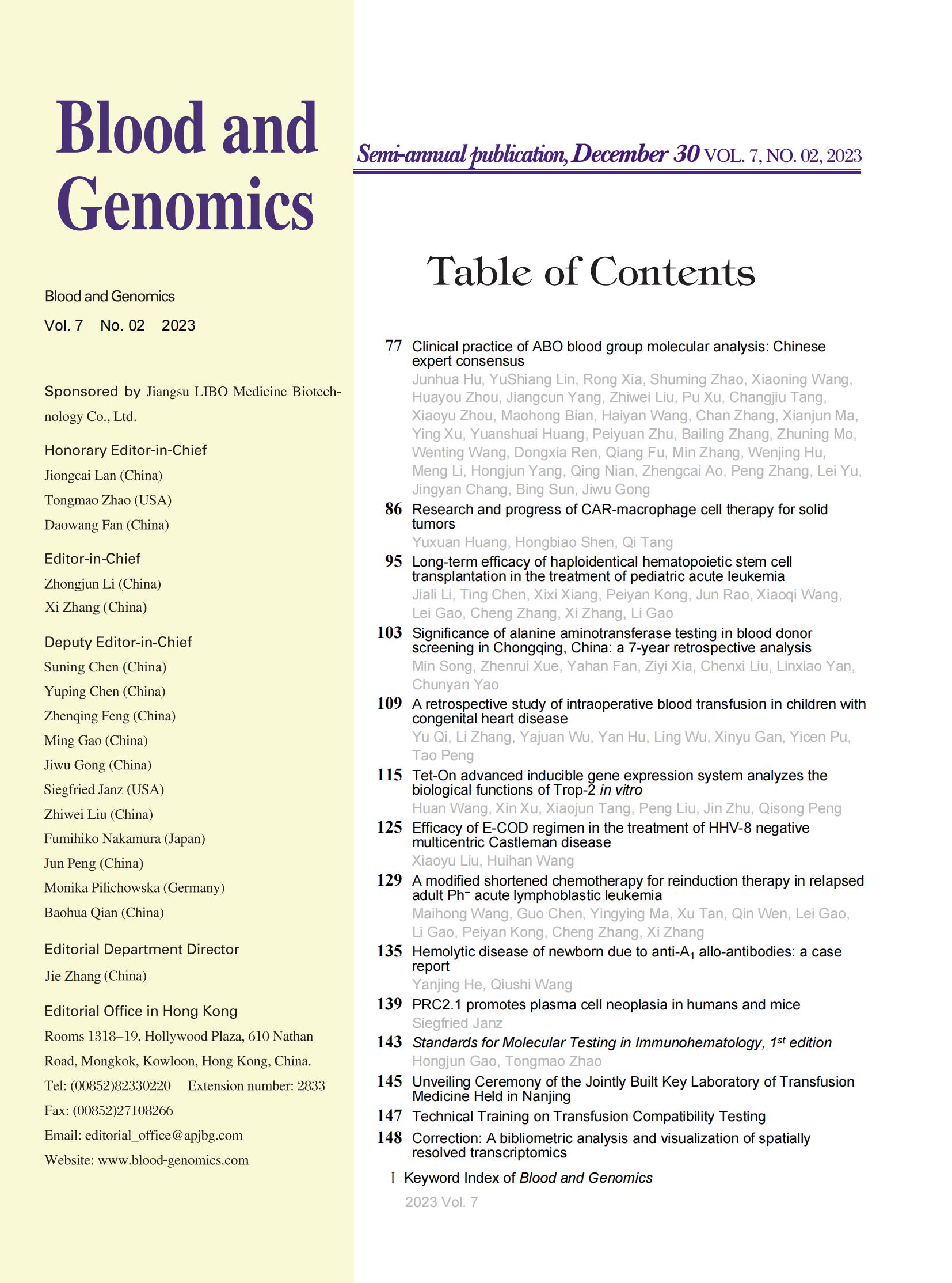 《Blood and Genomics》(ISSN:2707-8957)是一本經同行評議的國際英文期刊,致力于向全球學者和臨床醫生提供有關人類血液疾病、輸血、血液基因組學等前沿研究信息。《Blood and Genomics》編委會由來自中國、瑞典、瑞士、美國、法國、德國、澳大利亞、日本等國家的170余位專家組成。